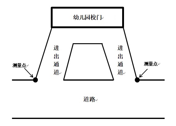 以幼儿园为参照点的,测量进出通道口向外延伸20米距离时,以幼儿园进出通道口与道路交汇最近一侧为测量点(图9)向外延伸行人可无障碍通行的最短距离进行测量,测量方法参照第三条。