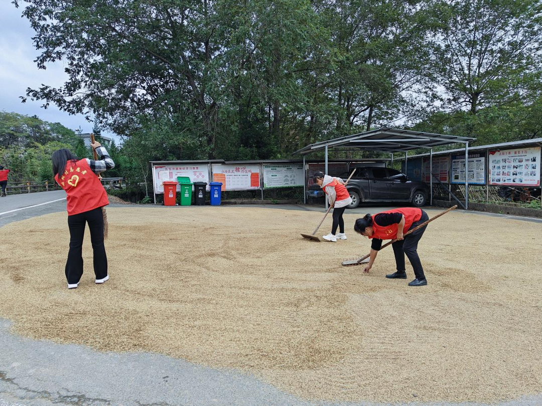 活动现场,志愿者们率先行动,手持扫帚、对广场进行全面清扫,清除杂物、平整地面,确保晒粮环境干净整洁。随后,大家又主动上前,帮村民搬运、摊开稻谷,金黄的稻粒在广场上铺成整齐的“毯子”,志愿者的红马甲在其中穿梭,成了乡村里最暖的风景线。