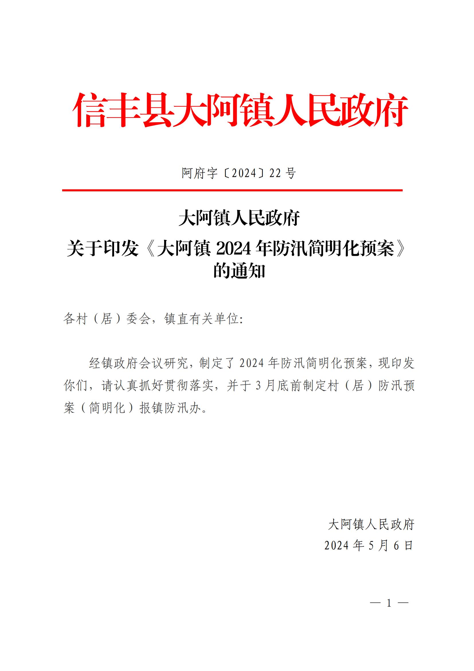 阿府字〔2024〕22号关于印发《大阿镇2024年防汛简明化预案》的通知
