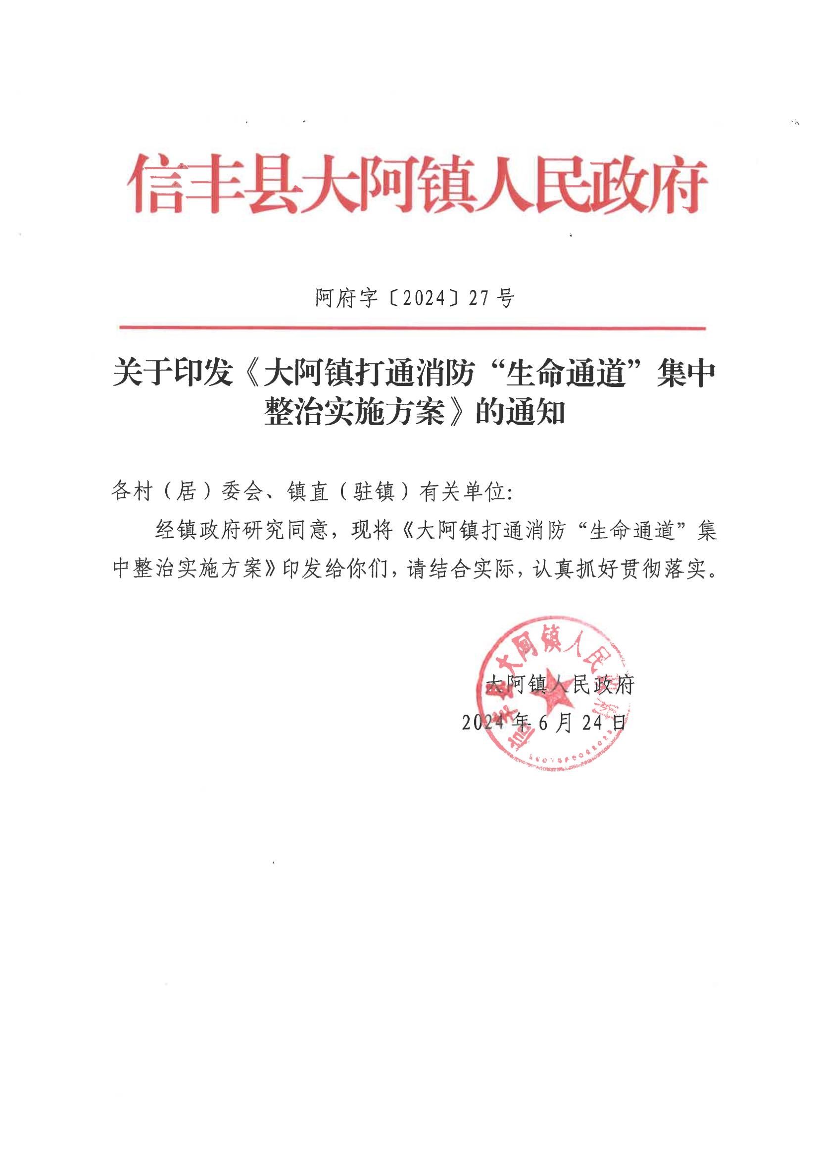 阿府字〔2024〕27号关于印发《大阿镇打通消防“生命通道”集中整治实施方案》的通知