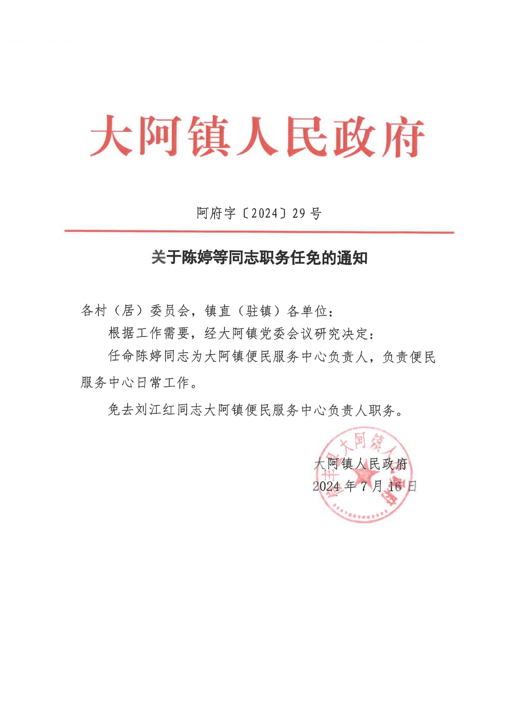 阿府字﹝2024﹞29号关于陈婷等同志职务任免的通知