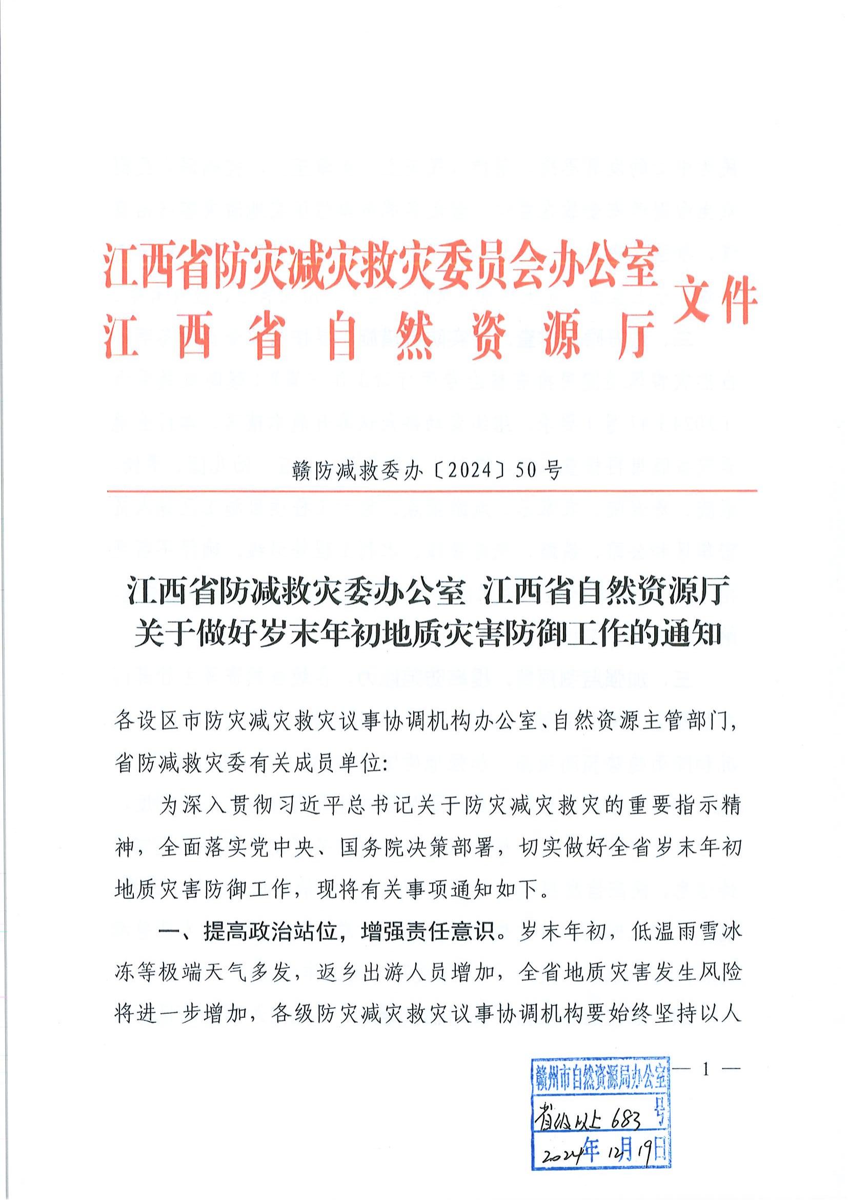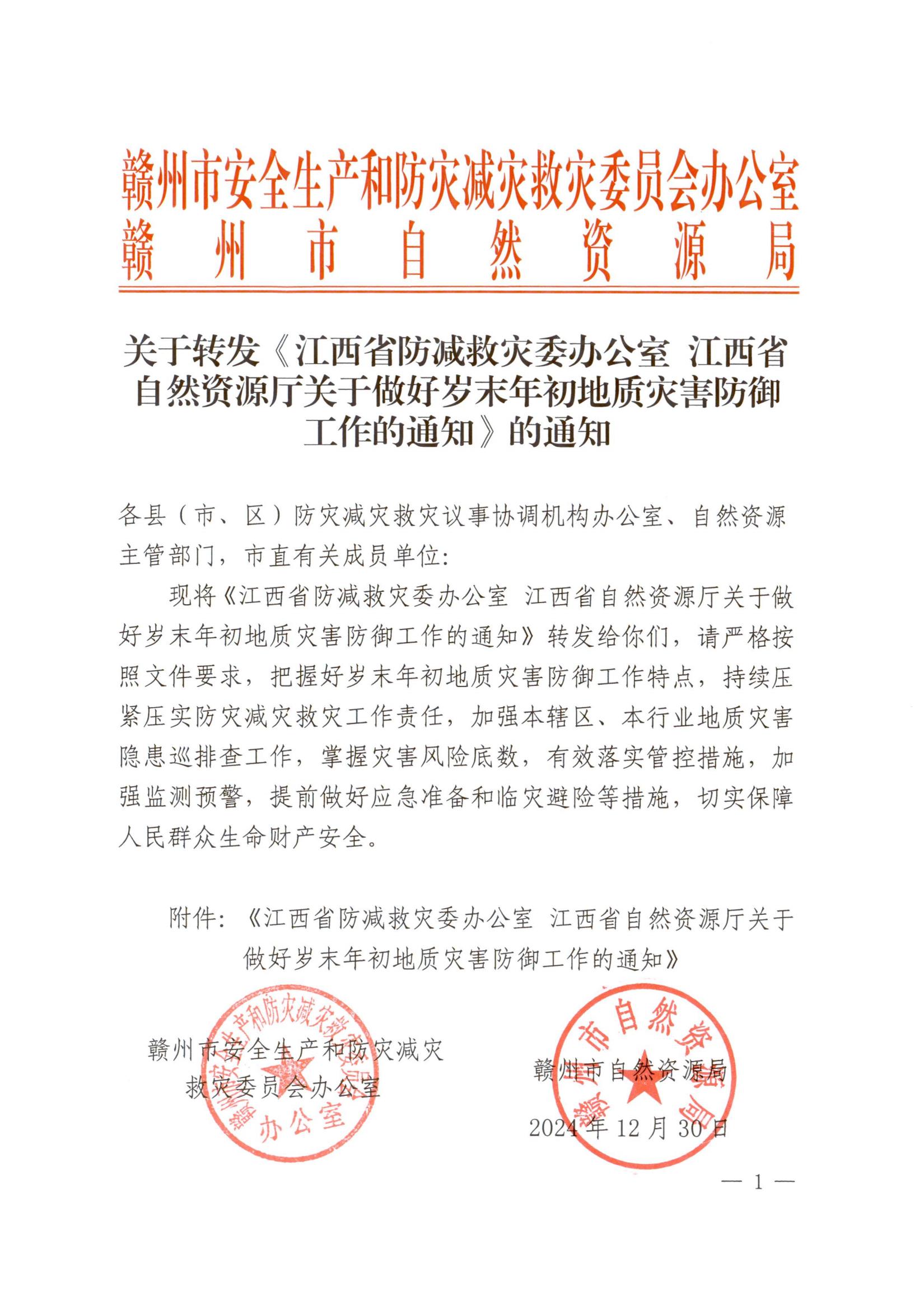 关于转发《江西省防减救灾委办公室江西省自然资源厅关于做好岁末年初地质灾害防御工作的通知》的通知