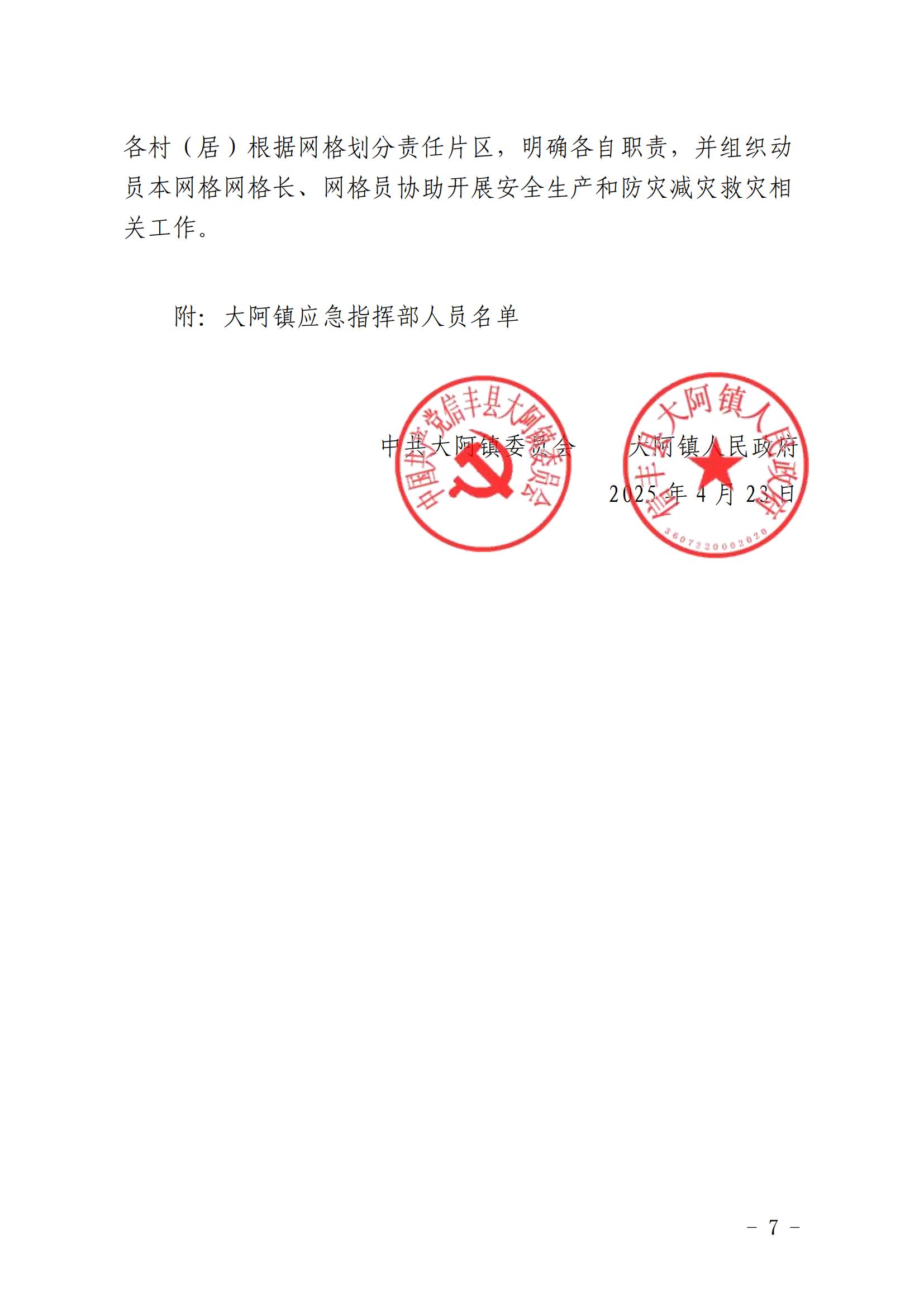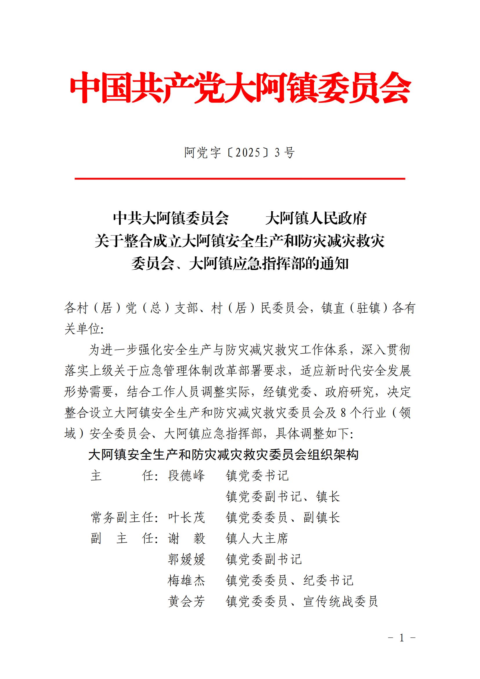阿党字〔2025〕3号关于整合成立大阿镇安全生产和防灾减灾救灾委员会、大阿镇应急指挥部的通知