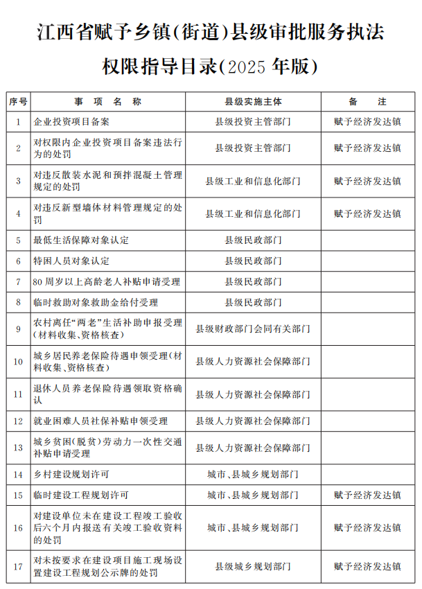 为深入贯彻落实《中共中央办公厅 国务院办公厅关于印发〈整治形式主义为基层减负若干规定〉的通知》等文件精神,进一步减轻基层负担,明晰基层权责,省政府决定对赋予乡镇(街道)县级审批服务执法权限有关指导目录进行优化调整,现将《江西省赋予乡镇(街道)县级审批服务执法权限指导目录(2025年版)》予以印发。各地各部门要提高政治站位,结合工作实际,抓好组织实施。