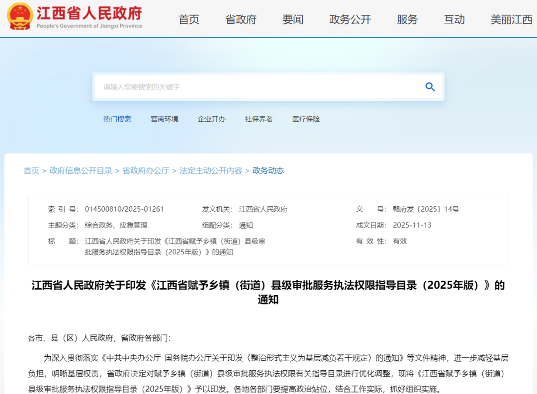 江西省人民政府关于印发《江西省赋予乡镇(街道)县级审批服务执法权限指导目录(2025年版)》的通知