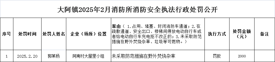 大阿镇2025年2月消防所消防安全执法行政处罚公开