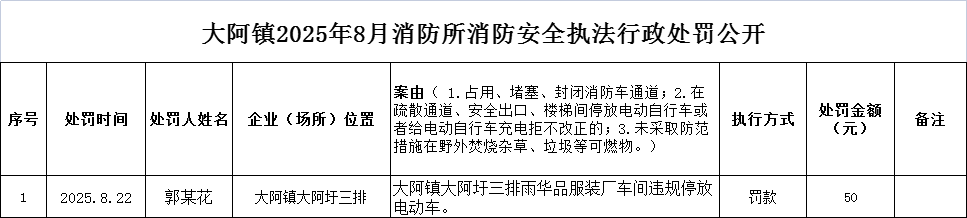大阿镇2025年8月消防所消防安全执法行政处罚公开