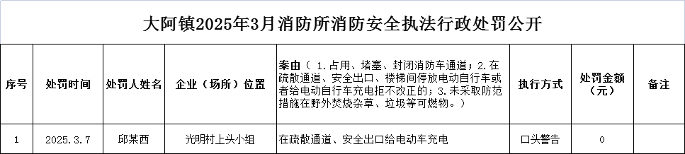 大阿镇2025年3月消防所消防安全执法行政处罚公开