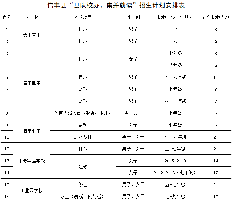 (一)信丰三中:初中男子排球(七、八年级),初中田径队(抽调集并就读文化学习保障学校);