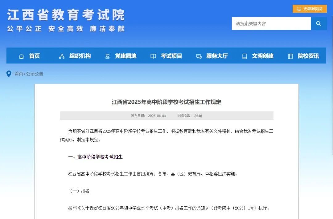 《江西省2025年高中阶段学校考试招生工作规定》