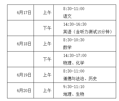 初三年级文化科目考试时间为6月17日至6月19日,初二年级文化科目考试时间为6月20日。体育与健康考试和物理、化学、生物实验操作考核时间由各设区市自行安排。