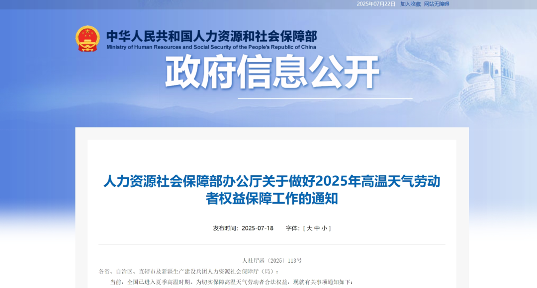 日前,人力资源社会保障部办公厅就2025年做好高温天气劳动者权益保障工作发出通知。全文如下: