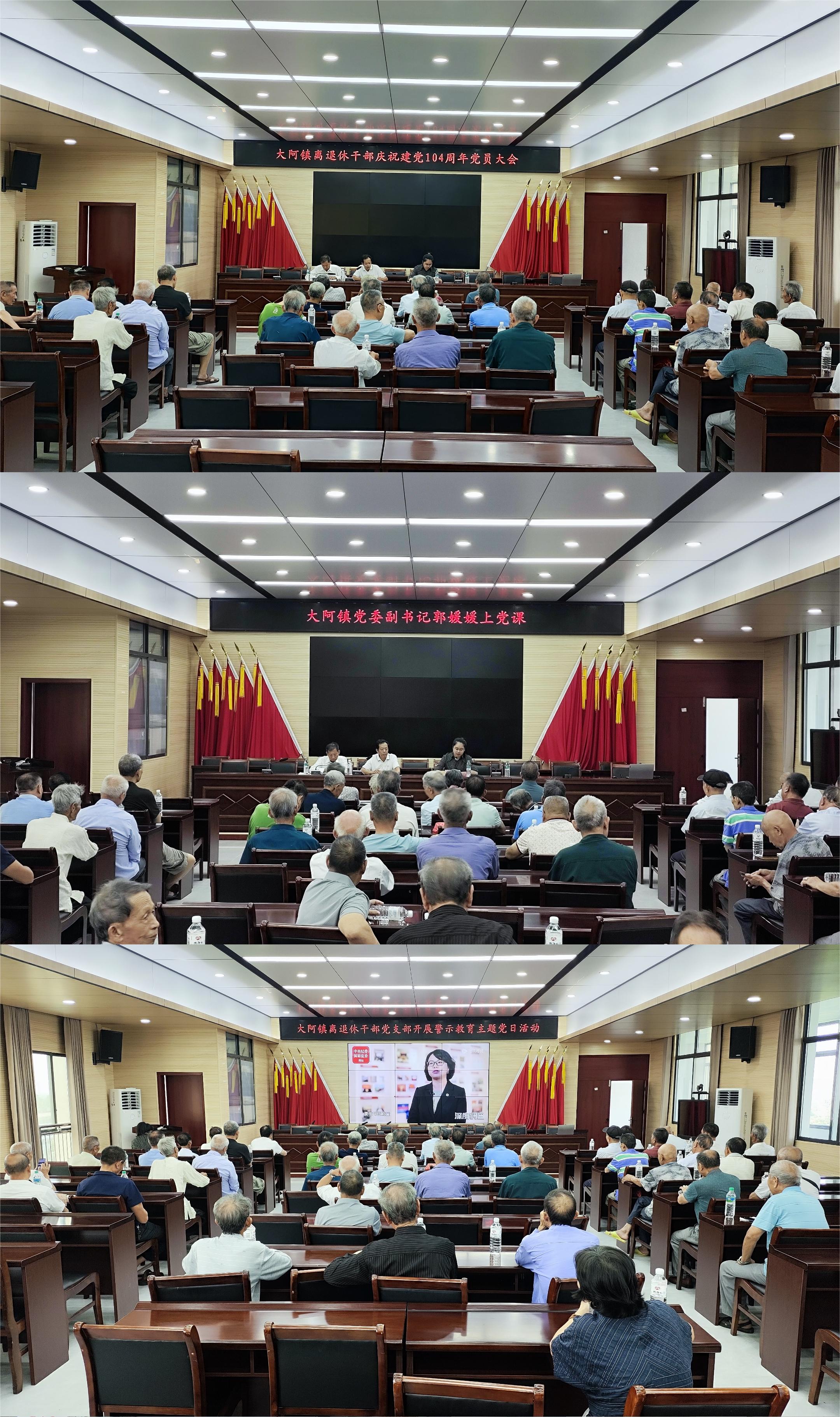 7月1日上午,大阿镇离退休干部党支部召开党员大会,庆祝中国共产党建党104周年,凝聚银发力量,强化党性教育。