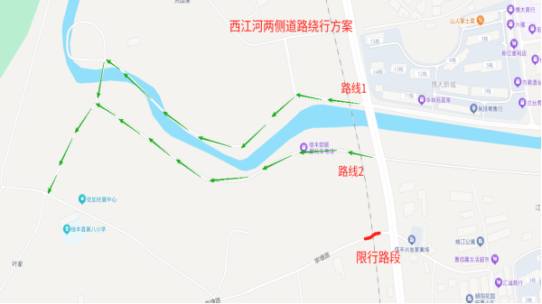 五、请禁止通行的车辆,绕行至西江河两侧道路。