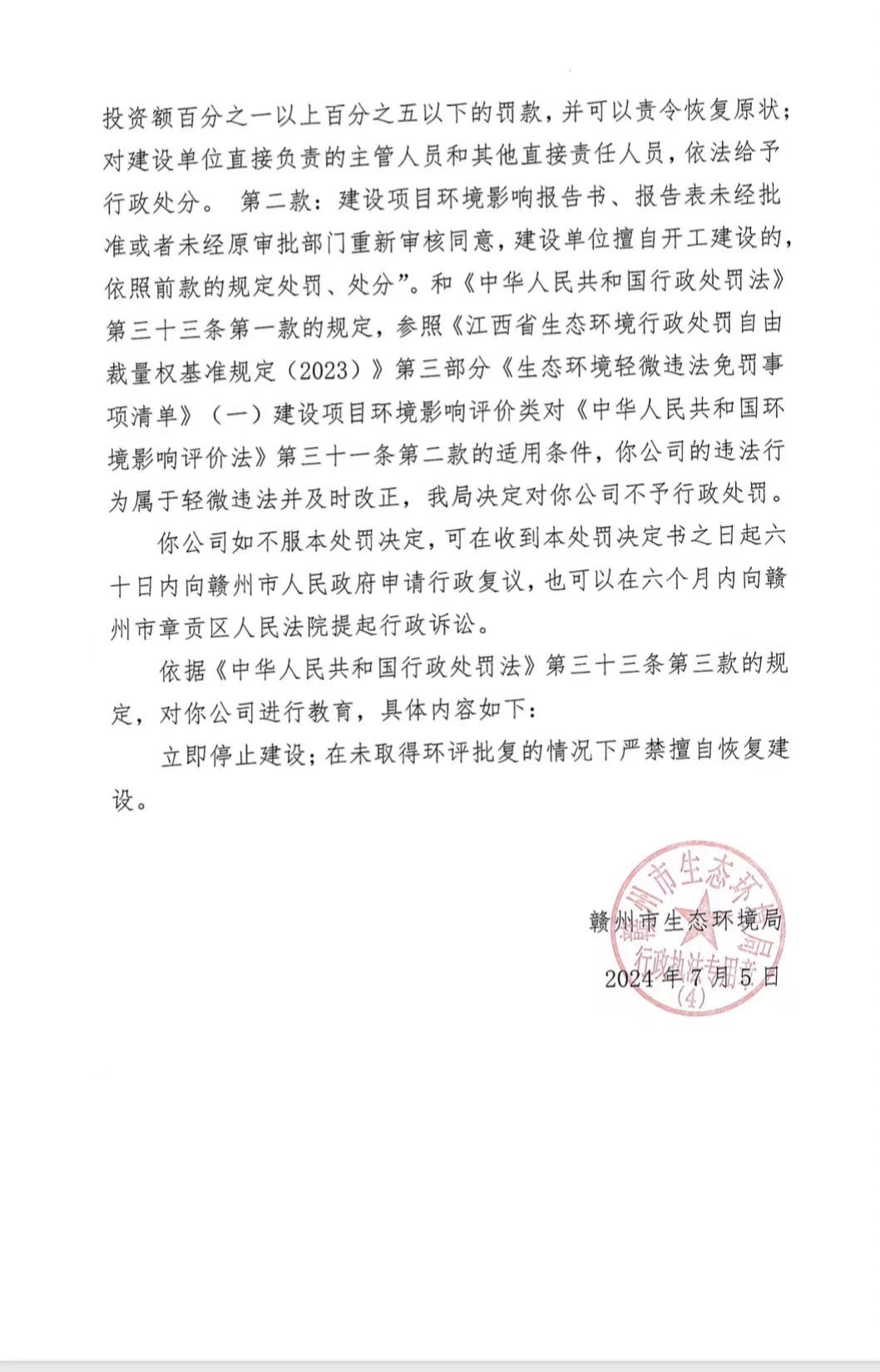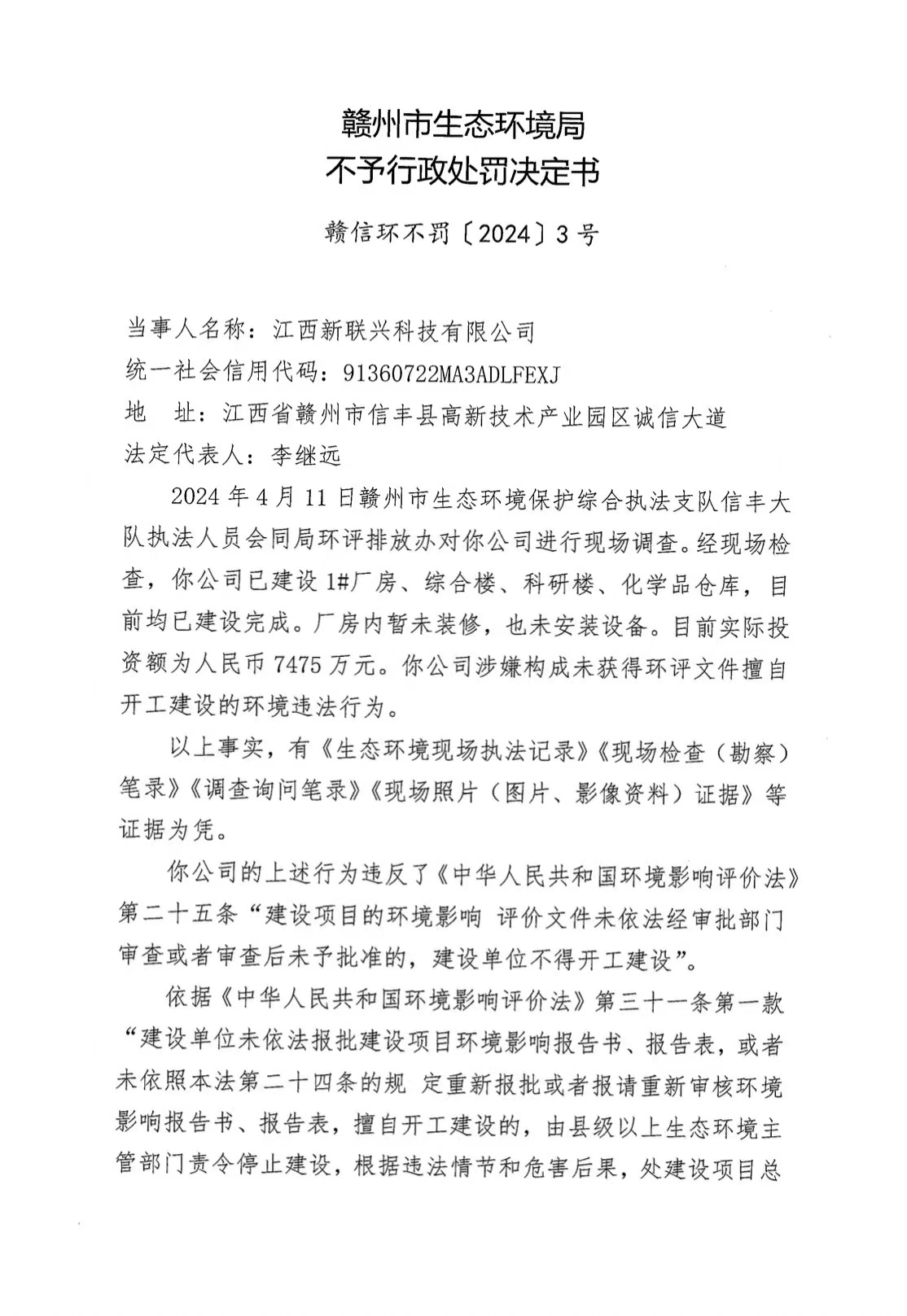 关于对江西新联兴科技有限公司不予行政处罚决定书
