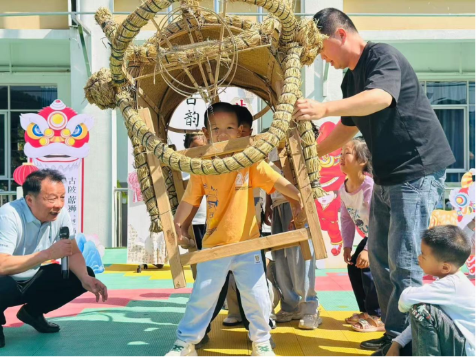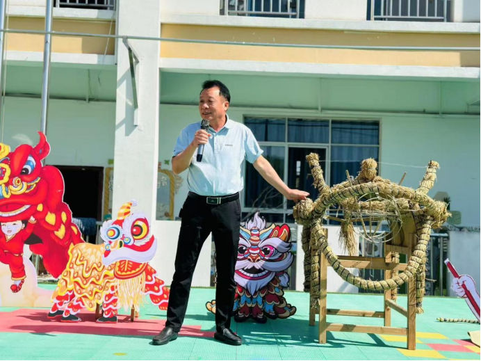 活动现场,古陂镇蓆狮犁狮传承人以生动的语言、丰富的实例,为孩子们开启了一场关于蓆狮犁狮的知识盛宴,竹编狮头、稻草狮身、可爱牛犊造型……孩子们轻轻触摸粗糙的草席、坚韧的竹骨,感受非遗手工艺的温度。讲述中,蓆狮犁狮的悠久历史与学生的纯真心灵悄然结合,碰撞出非遗传承的火花,为非遗赓续埋下信念的种子。