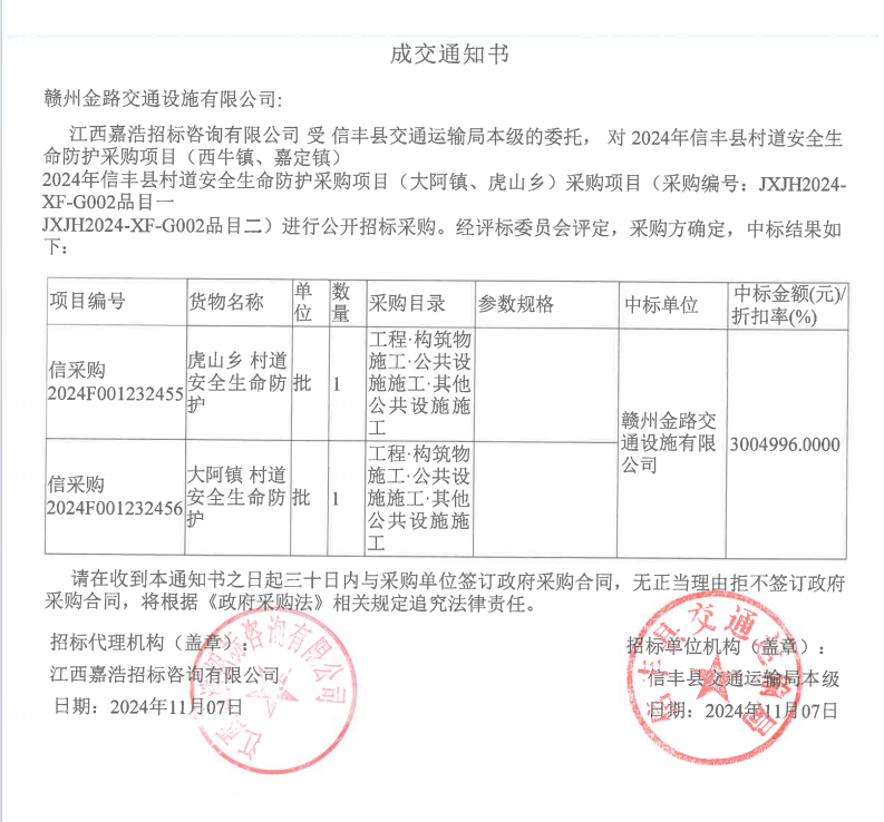 关于2024年信丰县农村公路安全生命防护工程中标结果的公示