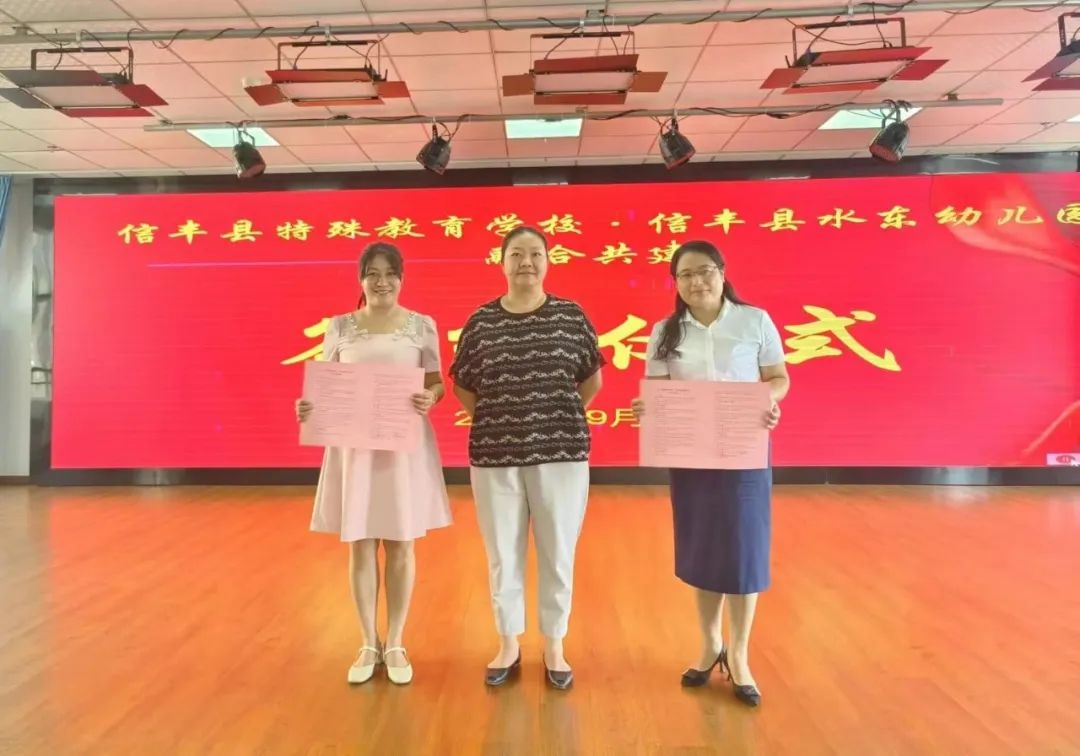 随后,水东幼儿园与县特教学校共同签订了合作共建协议。双方本着“优势互补、资源共享、互惠共赢、共同发展”的原则,在个别化教育方案制定、融合教育课程教学调整、教师专题培训等方面建立长期紧密的帮扶合作关系,通过个案跟踪、定期指导、师徒结对、联合教研等方式,打造普特优质融合教育发展新生态,推动我县学前融合教育向更高水平迈进。