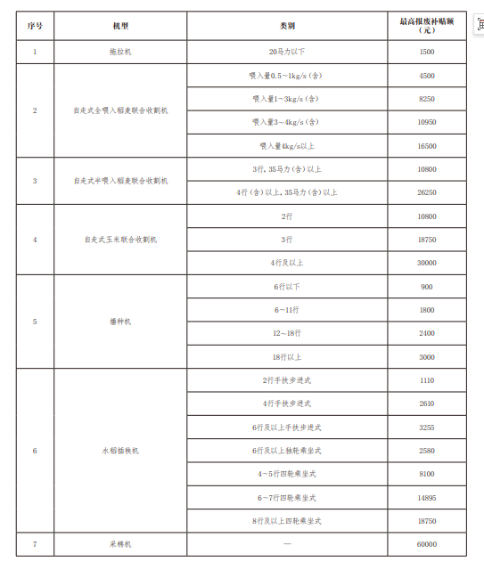 一、扩大报废补贴范围各省可在《农业农村部办公厅、财政部办公厅关于加大工作力度持续实施好农业机械报废更新补贴政策的通知》(农办机〔2024〕4号,以下简称《通知》)规定的拖拉机、播种机、联合收割机(含粮棉油糖等作物联合收割所用机械)、水稻插秧机、农用北斗辅助驾驶系统、机动喷雾(粉)机、机动脱粒机、饲料(草)粉碎机、铡草机等9个农机种类基础上,聚焦保障粮食和重要农产品稳定安全供给,结合实际自行确定不超过6个机具种类新增纳入报废补贴范围。新增纳入报废补贴范围的机具种类,按《通知》规定测算确定报废补贴标准,单台最高报废补贴额不超过2万元。