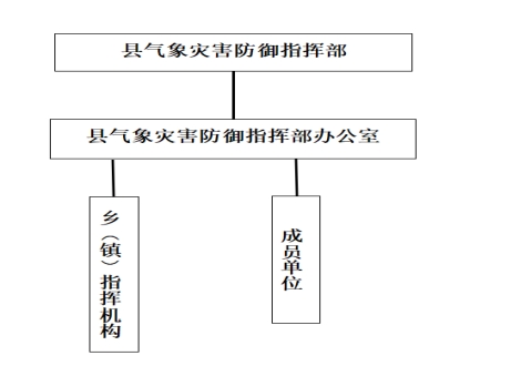 县人民政府设立县气象灾害防御指挥部(以下简称县指挥部),指挥部下设办公室为其办事机构,办公室设在县气象局。气象灾害防御组织体系见下图:
