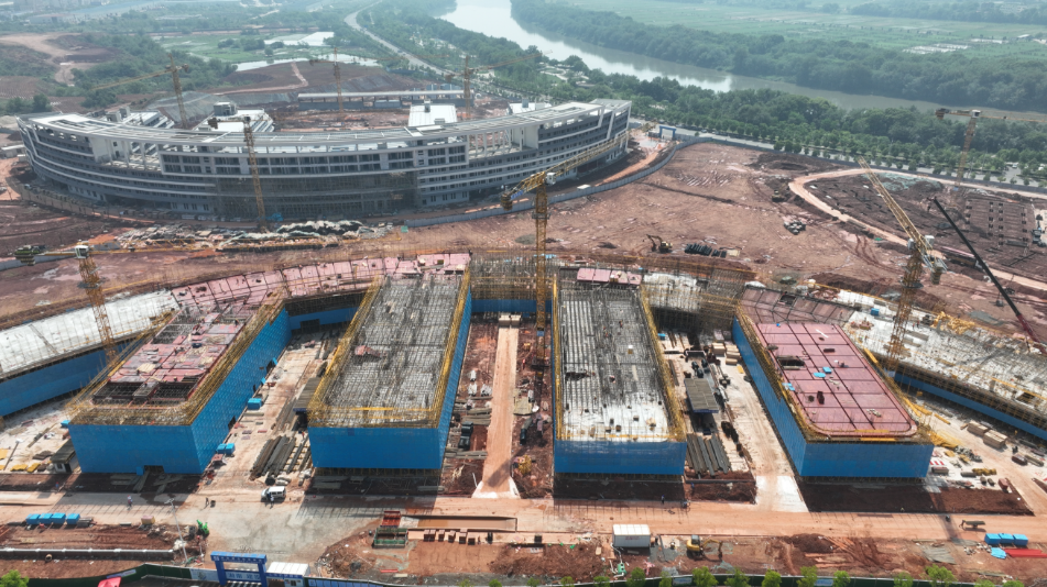 “五一”假期首日,在信丰大学城(职业教育教学中心)项目现场,机器轰鸣、人员穿梭、桩机起落、焊花闪烁……处处涌动着争分夺秒的奋进热潮。一座座建筑拔地而起,一期教学楼、食堂、宿舍楼主体基本完工,室内外装修正在紧张推进中,预计今年9月交付使用。