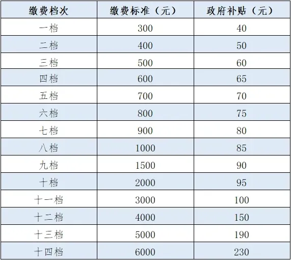 按照现行政策,城乡居民养老保险个人缴费标准为每人每年300元、400元、500元、600元、700元、800元、900元、1000元、1500元、2000元、3000元、4000元、5000元、6000元14个档次,参保对象可自主选择缴费档次,政府根据不同缴费标准给予参保对象相应财政补贴,多缴多得,长缴多得。