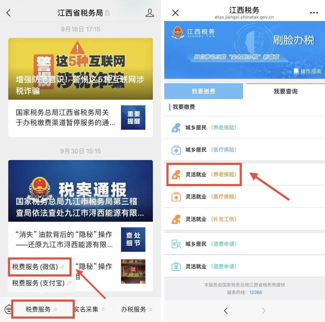 关注“江西省税务局”微信公众号,点击左下角“税费服务(微信)”→选择“灵活就业(养老保险)”→输入操作人员的姓名和身份证号码并进行人脸识别后,即可进入缴费页面,再输入缴费人的姓名和证件号码等信息,选择缴费年度,确认信息无误即可缴费。