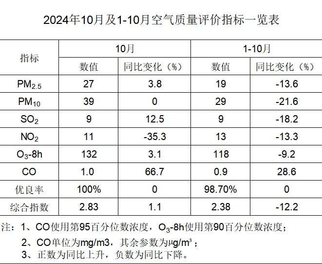 2024年10月,我县中心城区开展环境空气质量监测,监测点位共2个,分别是信丰县环保局、信丰县行政中心,其中评价点2个,中心城区监测参数浓度取评价点均值。监测项目为PM2.5、PM10、SO2、NO2、CO、O3-8h,月均值分别为27µg/m³、39µg/m³、9µg/m³、11µg/m³、1.0mg/m³、132µg/m³。中心城区环境空气质量优9天,良22天,优良率100%。