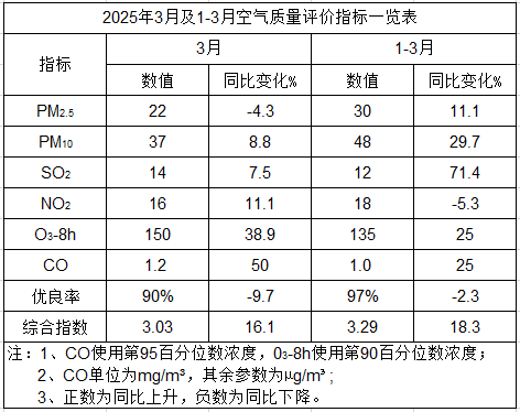2025年3月,我县中心城区开展环境空气质量监测,监测点位共2个,分别是信丰县环保局、信丰县行政中心,其中评价点2个,中心城区监测参数浓度取评价点均值。监测项目为PM2.5、PM10、SO2、NO2、CO、O3_8h,月均值分别为22µg/m³、 37µg/m³、14µg/m³、16µg/m³、1.2mg/m³、150µg/m³,达国家二级标准。中心城区环境监测有效天数31天,空气质量优18天,良10天,轻度污染3天,优良率90.3%。