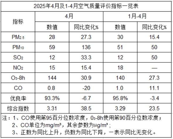 2025年4月,我县中心城区开展环境空气质量监测,监测点位共2个,分别是信丰县环保局、信丰县行政中心,其中评价点2个,中心城区监测参数浓度取评价点均值。监测项目为PM2.5、PM10、SO2、NO2、CO、O3_8h,月均值分别为28µg/m³、 59µg/m³、12µg/m³、15µg/m³、0.8mg/m³、144µg/m³,达国家二级标准。中心城区环境监测有效天数30天,空气质量优10天,良18天,轻度污染1天,中度污染1天,优良率93.3%。(四月份,中心城区受沙尘传输影响,造成污染天数2天,同时两项颗粒物浓度均为未剔除沙尘影响的浓度值。)
