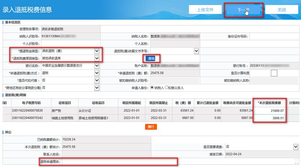 3.进入误收多缴退抵税页面后,带*号的内容为必填项,部分信息系统会自动带出;在下拉列表选择“提退税金类型”和“退抵税费原因类型”,再点击查询按钮,在弹出的窗口选择对应的票证种类、税款所属期后,查询出纳税人原申报入库明细,勾选需要申请退税的明细条目并点击确定后,系统会将勾选的原申报入库明细带入“退抵税费明细”栏目,请在“本次退抵税费额”单元格填写退税金额。核实账户名称和银行账号,填写退税申请理由。账户需要变更的,企业可在【我要办税】-【综合信息报告】-【制度信息报告】-【存款账户账号报告】功能变更,自然人可在【我要办税】-【一般退(抵)税管理】-【存款账户账号报告】功能变更。