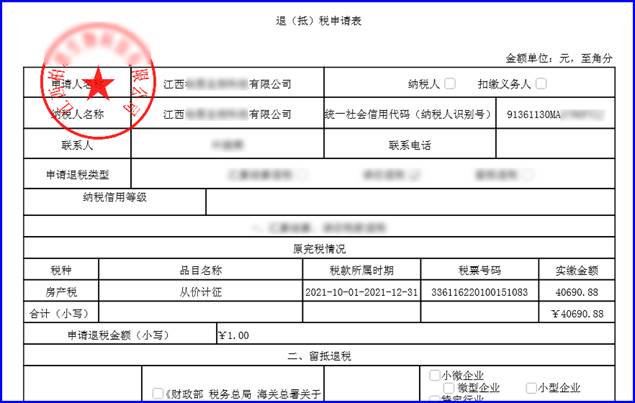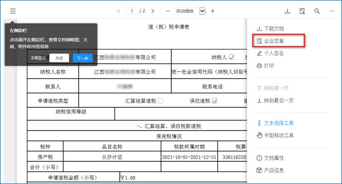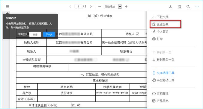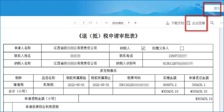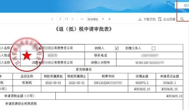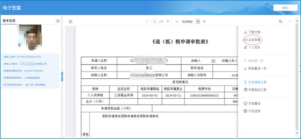 认证成功后,进入退抵税申请表后点右侧“企业签章”,选择相应的印章后,调整印章页面位置,点击确定后完成盖章。