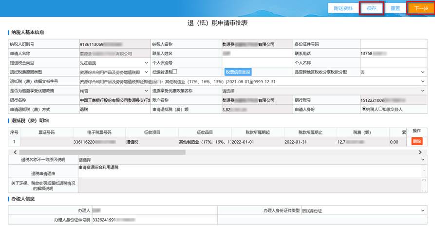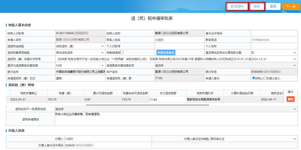 5.请在“本次退抵税费额”单元格填写退税金额;核实账户名称和银行账号,账户需要变更的可在电子税务局【我要办税】-【综合信息报告】-【制度信息报告】-【存款账户账号报告】功能变更。填写退税申请理由;如申请人与企业名称不一致需要选择“退税名称不一致原因说明”,核实所有填报的信息无误后,点击保存按钮,系统保存申请表,再点击附送资料按钮,进入资料上传界面。
