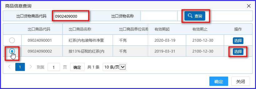 双击出口商品代码单元格,系统弹出商品信息查询界面,输入对应的出口货物商品代码,查询出口商品名称,点击选择后,系统自动填入商品代码。
