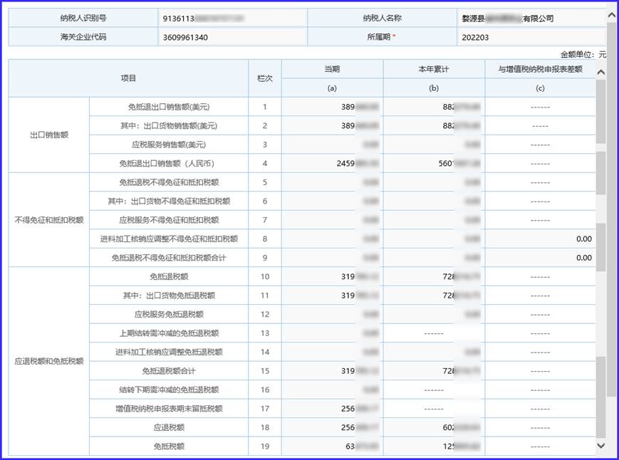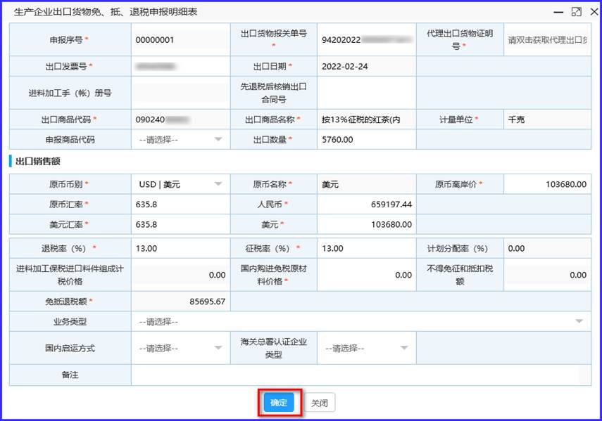 以上内容填报完毕后,系统将自动带出出口销售额的各项数据,请核实数据准确性,并可自行修改,确认数据无误后,点击确定按钮,回到生产企业出口货物免、抵、退申报明细表页面。