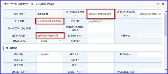 点击生产企业出口货物免、抵、退申报明细表页面的添加按钮,系统弹出明细填写页面。