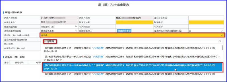 3.系统打开退(抵)税申请审批表页面,黄色底色的单元格为必填项,部分信息系统会自动带出;在下拉列表选择“提退税金类型”为“减免退税”,“退抵税费原因类型”为“其他减免退库”,“退抵税(费)依据文书字号”选择“《财政部 税务总局关于进一步实施小微企业“六税两费”减免政策的公告》”,可通过搜索快速选择到对应的政策;“申请退抵税方式”选择“退税”;联系人姓名、联系电话要填写完整。
