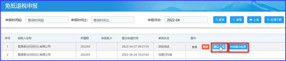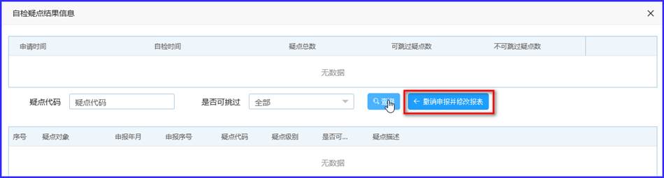 4.回到免抵退说申报界面,可查看申报表审核状态,自检不通过的,可点击自检疑点信息按钮,弹出自检疑点结果信息界面,点击修改按钮可修改申报表。