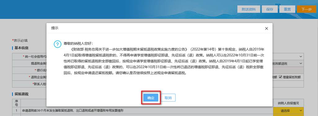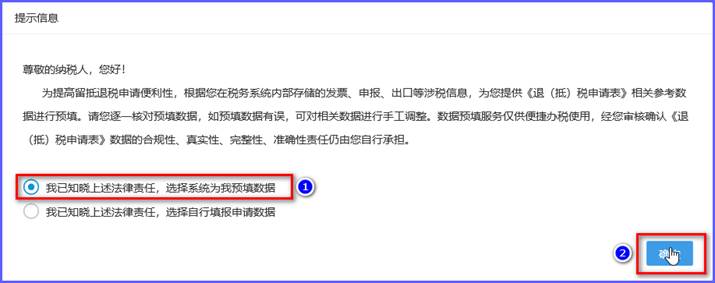 3.进入留抵退税申请页面后,系统会提示纳税人是否符合政策规定申请留抵退税,点击【确定】后,系统继续提示是否需要预填数据。为提高数据填写准确性和效率,一般选择“系统为我预填数据”选项,系统自动为纳税人预填申请表数据;如纳税人选择“自行填报数据”则不加载预填信息,均由纳税人自行选择或填报。