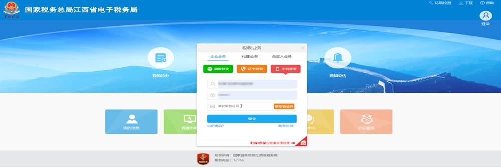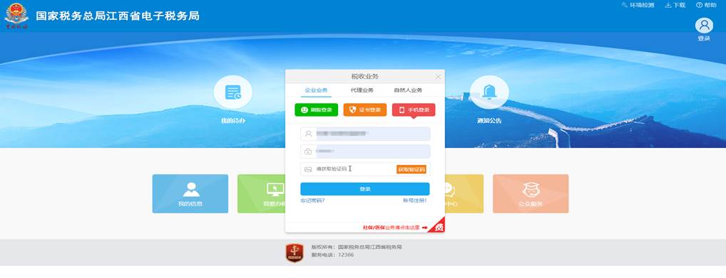 1.通过IE9以上版本浏览器打开网址https://etax.jiangxi.chinatax.gov.cn/etax/jsp/index.jsp或者通过搜索引擎搜索江西省电子税务局官网,进入江西省电子税务局页面,点击我要办税按钮后,输入相关登录信息完成纳税人登录。