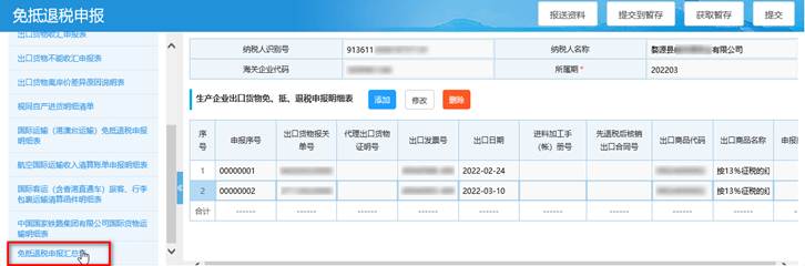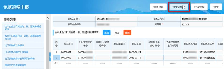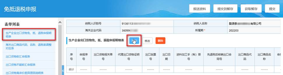 在生产企业出口货物免、抵、退申报明细表界面,点击提交到暂存按钮,保存填报的数据。