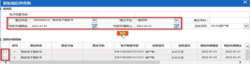 4.点击税票信息查询按钮,在弹出的窗口选择对应的票证种类、税款所属期后,查询出纳税人原申报入库明细,勾选需要申请退税的明细条目并点击确定后,系统会将勾选的原申报入库明细带入“退抵税费明细”栏目。