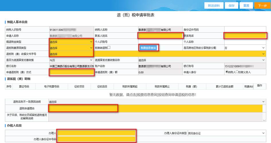 3.系统打开退(抵)税申请审批表页面,黄色底色的单元格为必填项,部分信息系统会自动带出;在下拉列表选择“提退税金类型”为“先征后退”,“退抵税费原因类型”为“资源综合利用产品及劳务增值税即征即退”,“退抵税(费)依据文书字号”选择“资源综合利用产品及劳务增值税即征即退”;“申请退抵税方式”选择“退税”;联系人姓名、联系电话要填写完整。