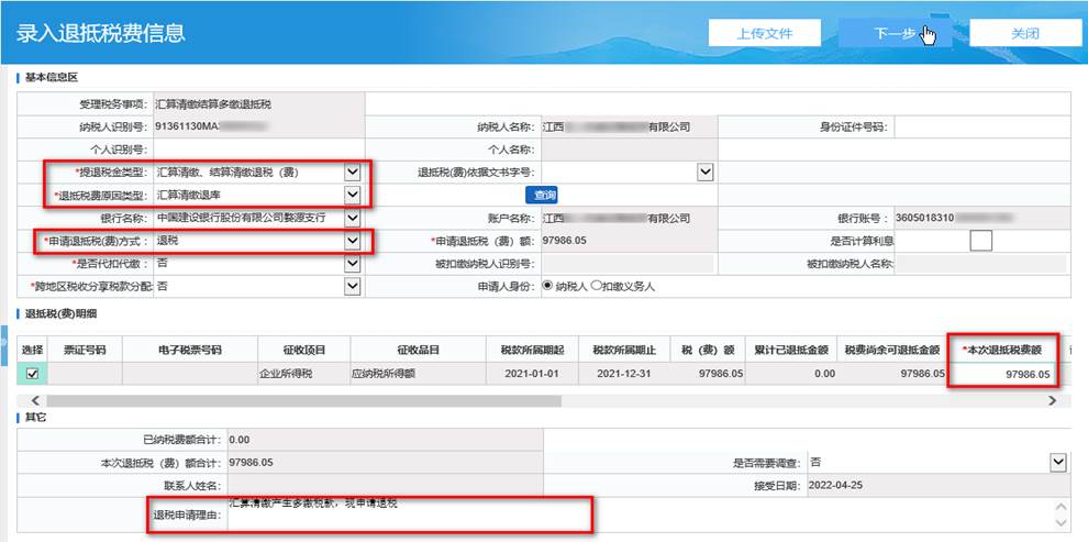 3.进入汇算清缴结算多缴退抵税页面后,带*号的内容为必填项,部分信息系统会自动带出;提退税金类型选择“汇算清缴、结算清缴退税(费)”后,系统会在“退抵税费明细”栏目自动带出纳税人前期申报后产生的多缴税款明细,请在“本次退抵税费额”单元格填写退税金额。核实账户名称和银行账号,账户需要变更的可在电子税务局【我要办税】-【综合信息报告】-【制度信息报告】-【存款账户账号报告】功能变更。填写退税申请理由。