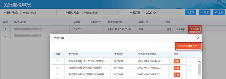 申报成功后,系统自动制作文书,并可打包下载所有文书。