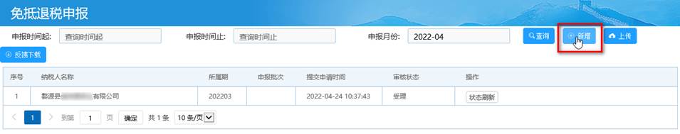 3.进入出口退税在线申报页面后,点击【出口退(免)税申报】标签页下的【免抵退税申报】功能,弹出免抵退税申报页面,点击新增按钮,进入生产企业出口货物免、抵、退申报明细表页面。