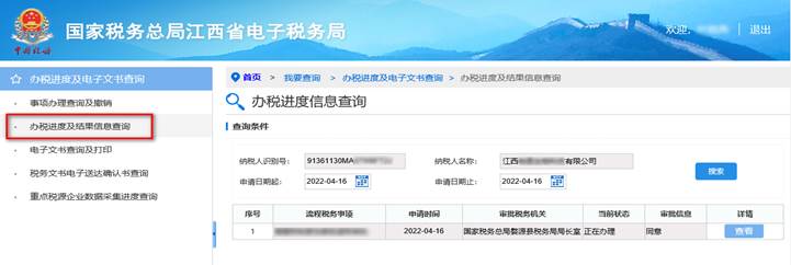 4.完成申请后,可在电子税务局【我要查询】-【办税进度及电子文书查询】-【办税进度及结果信息查询】功能内查询流程状态。