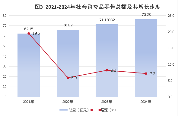 全年社会消费品零售总额76.28亿元,比上年增长7.2%。限额以上单位消费品零售额22.17亿元,增长19.9%。网上零售额2.14亿元,增长22%。