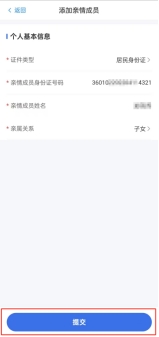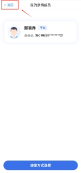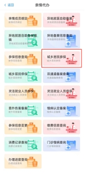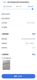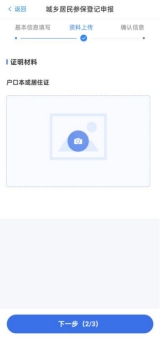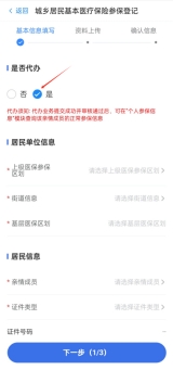 4. 成功绑定情亲成员后,点击“返回”按钮回到上一页,点击进入“城乡居民参保”,是否代办选择“是”,并按要求输入相关信息,点击“下一步”,上传户口本或居住证照片,点击“下一步”,信息确认无误后点击“提交”即可。