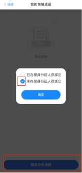 3. 点击“绑定方式选择”按钮,选择“未办理身份证人员绑定”,点击“确定”,输入新生儿的相关身份信息后,点击“提交”,选择“已阅读承诺书”点击“我已阅读并同意”。